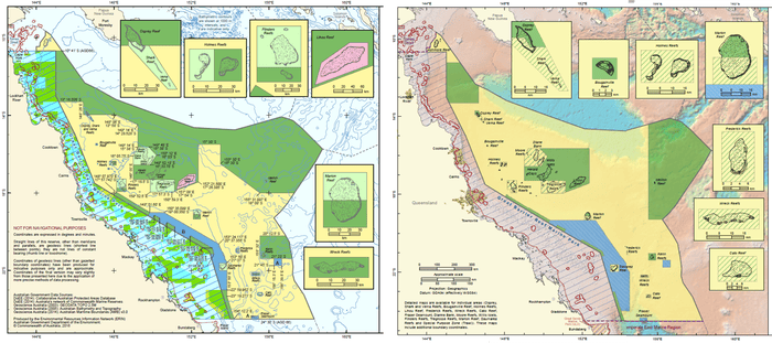 The two maps show the already reduced green ‘no take’ zones in the Coral