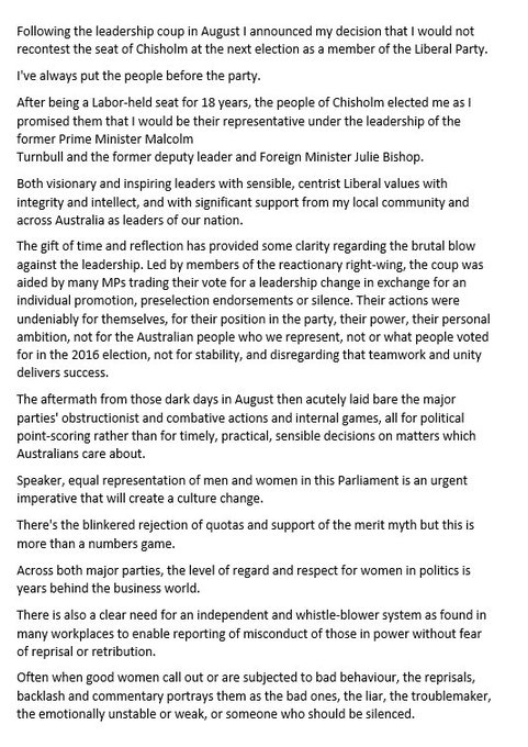 - Julia Banks leaves the Liberal Party after complaining about behaviour of colleagues