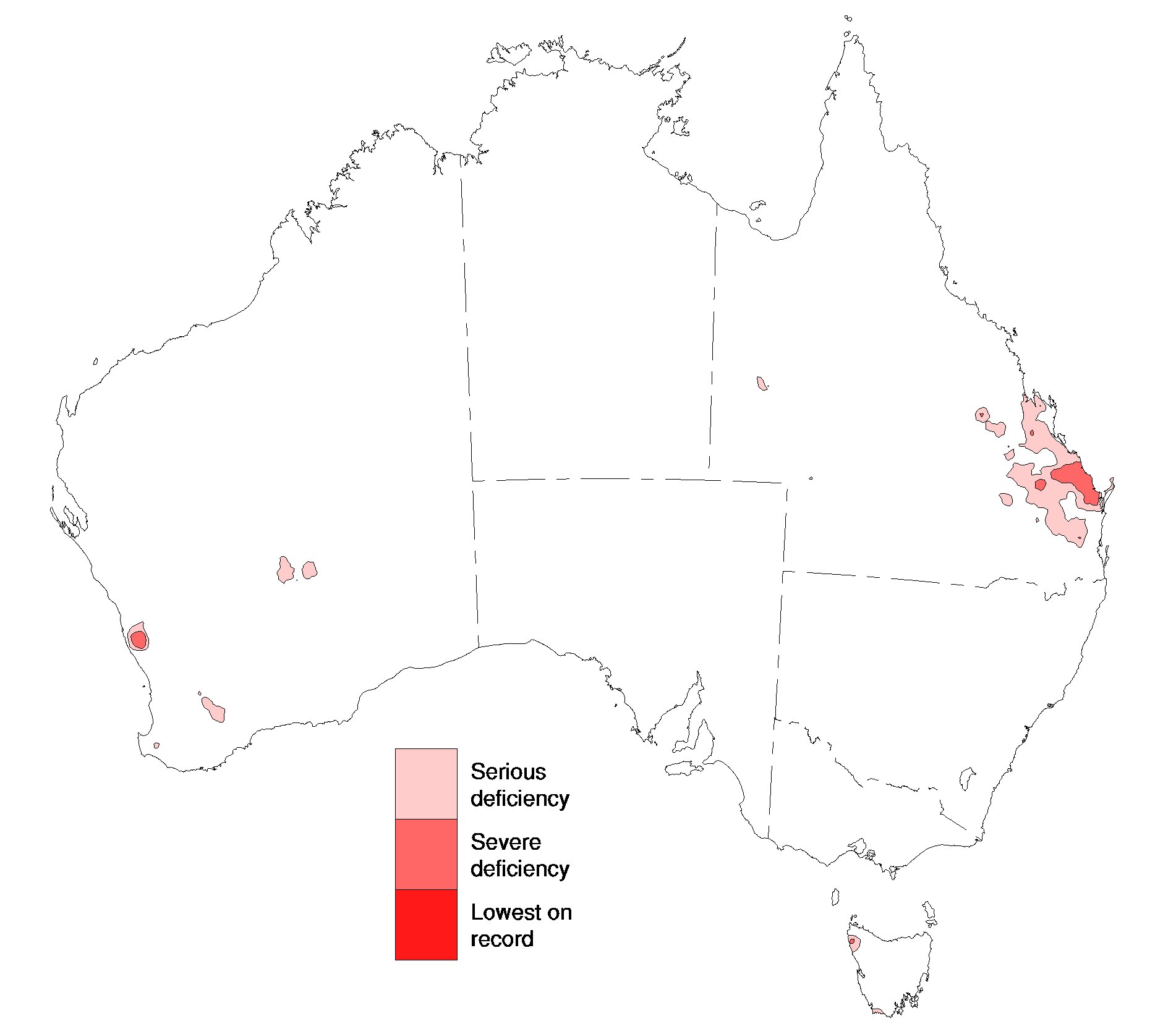 - BOM classes severe rainfall deficiency as receiving rain in the lowest 5 per cent of records