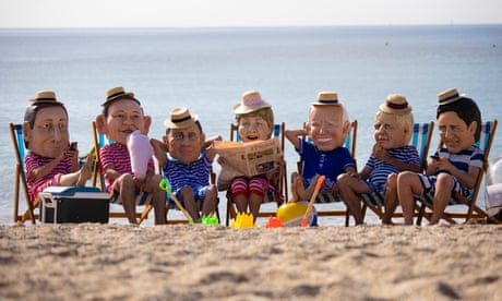 Oxfam campaigners posed as G7 leaders on Swanpool Beach. Photograph: Jon Rowley/EPA