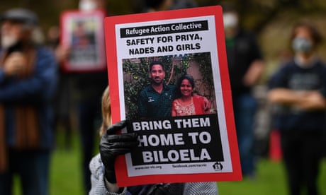 A demonstrator outside Parliament House in Canberra on Tuesday displays a sign in support of the Biloela Tamil family. Photograph: Lukas Coch/EPA