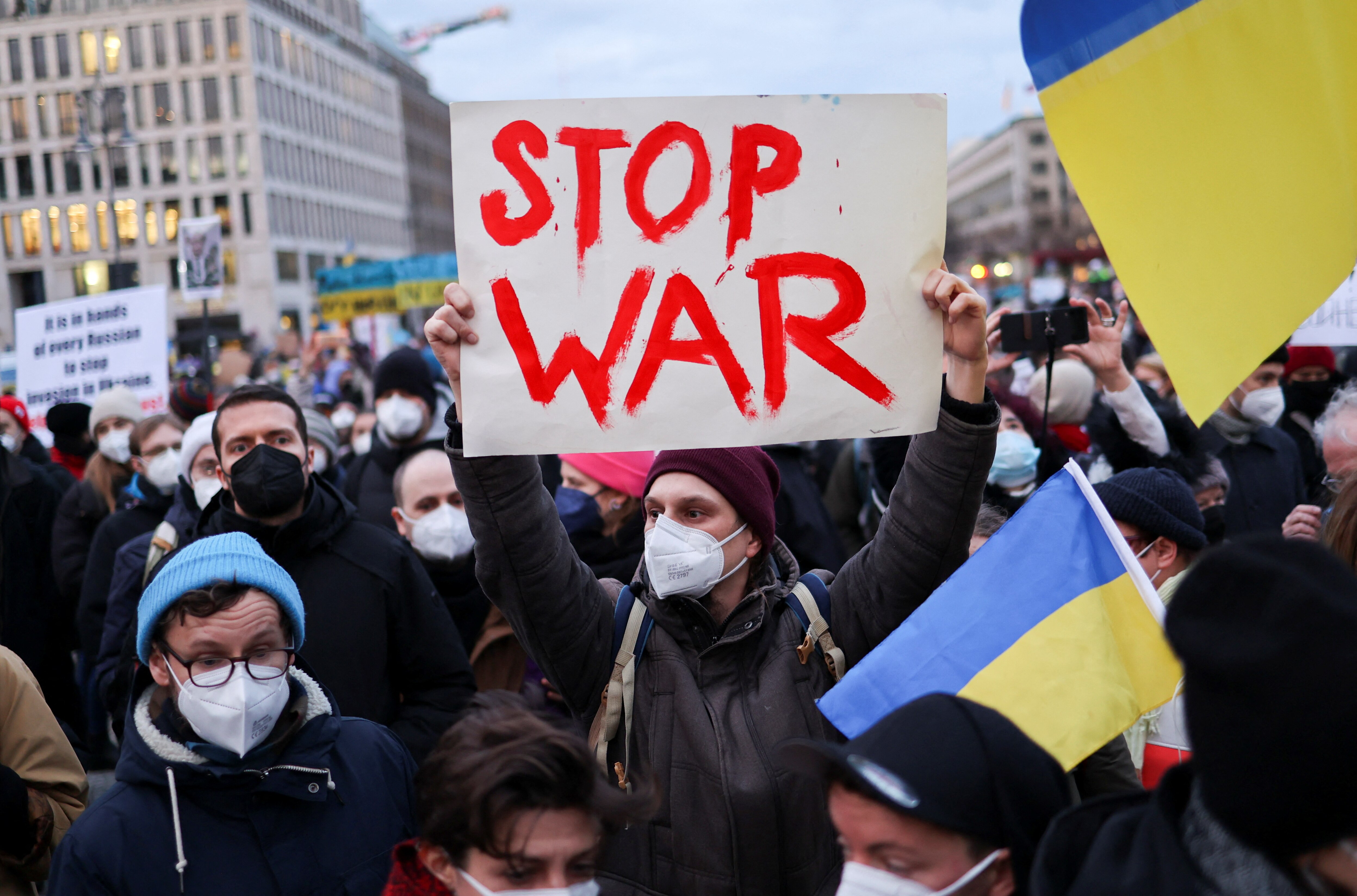 Many of the demonstrators, including Ukrainian expats, chanted slogans in support of Ukraine and held banners saying "Ukraine will resist" and "Stop Putin, Stop war".