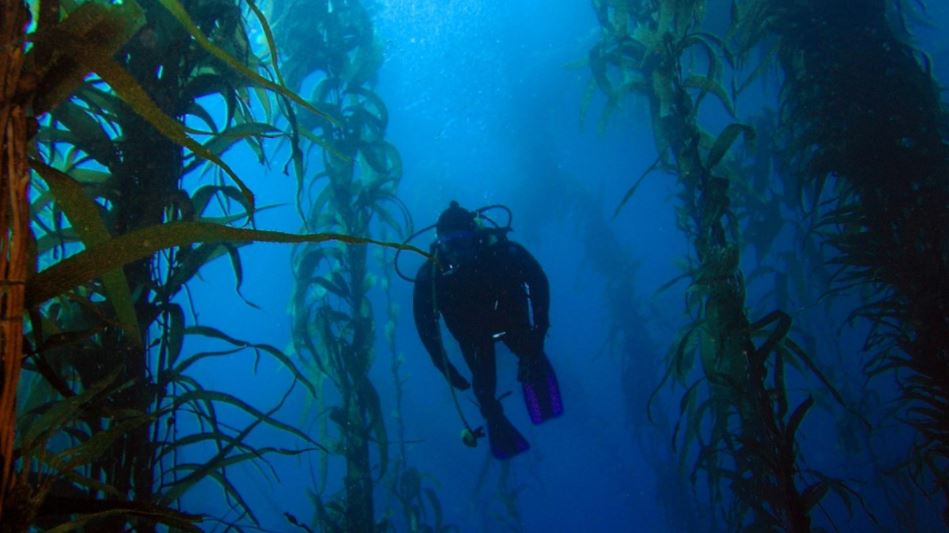A scuba diver swimming near giant kelp growing from the sea floor