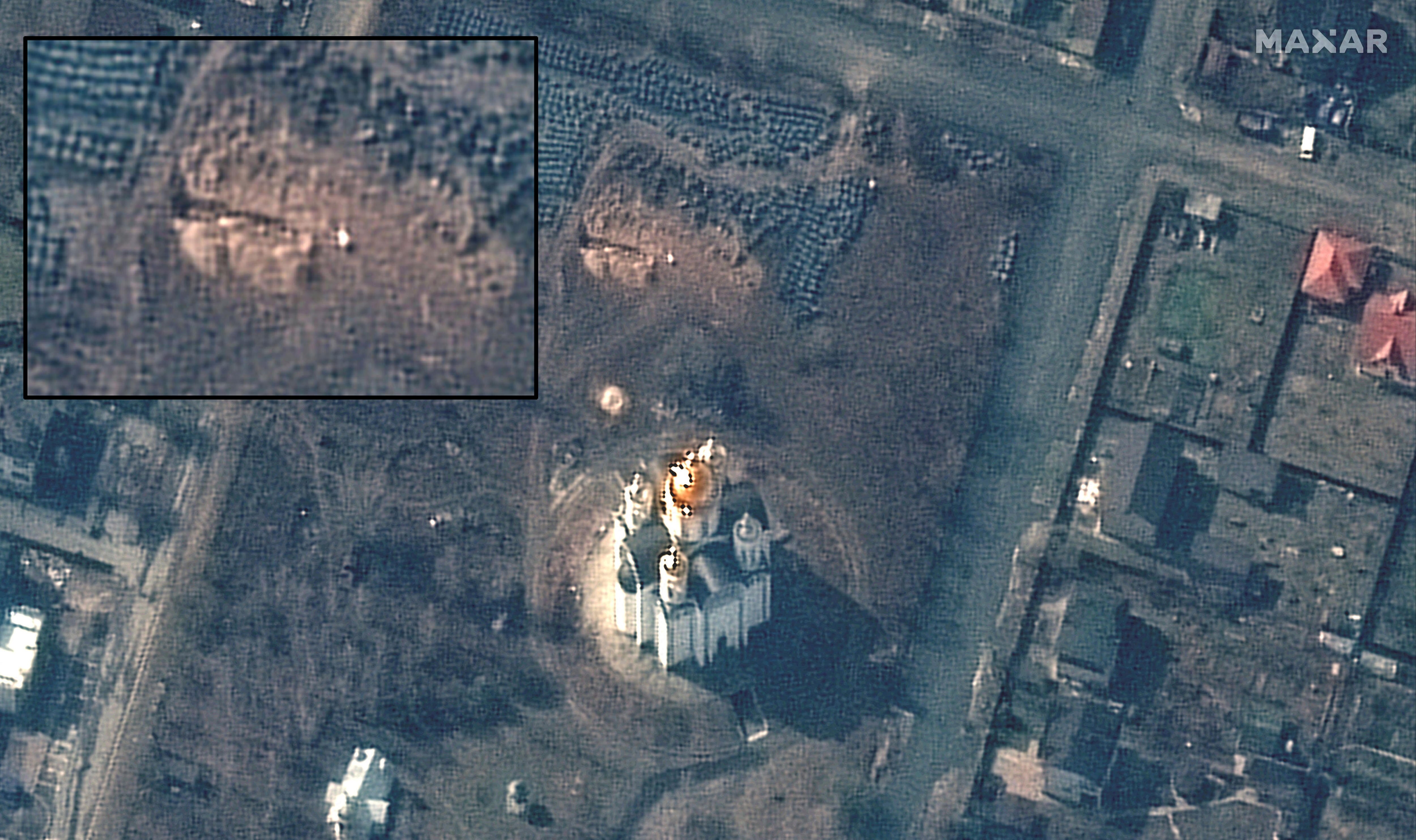 Satellite imagery provided by Maxar Technologies shows the grounds behind the Church of St Andrew and Pyervozvannoho All Saints below.
