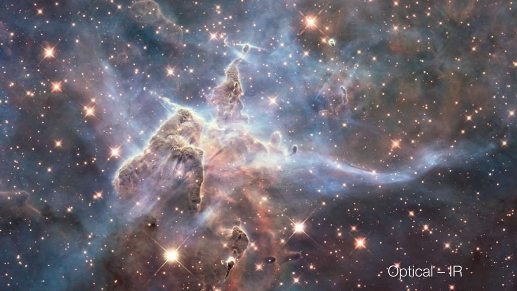 A set of Hubble images released in 2018 show what it looks like in optical light (the light we see with our eyes), and in near-infrared light, which can cut through dust in the pillars to see new stars.