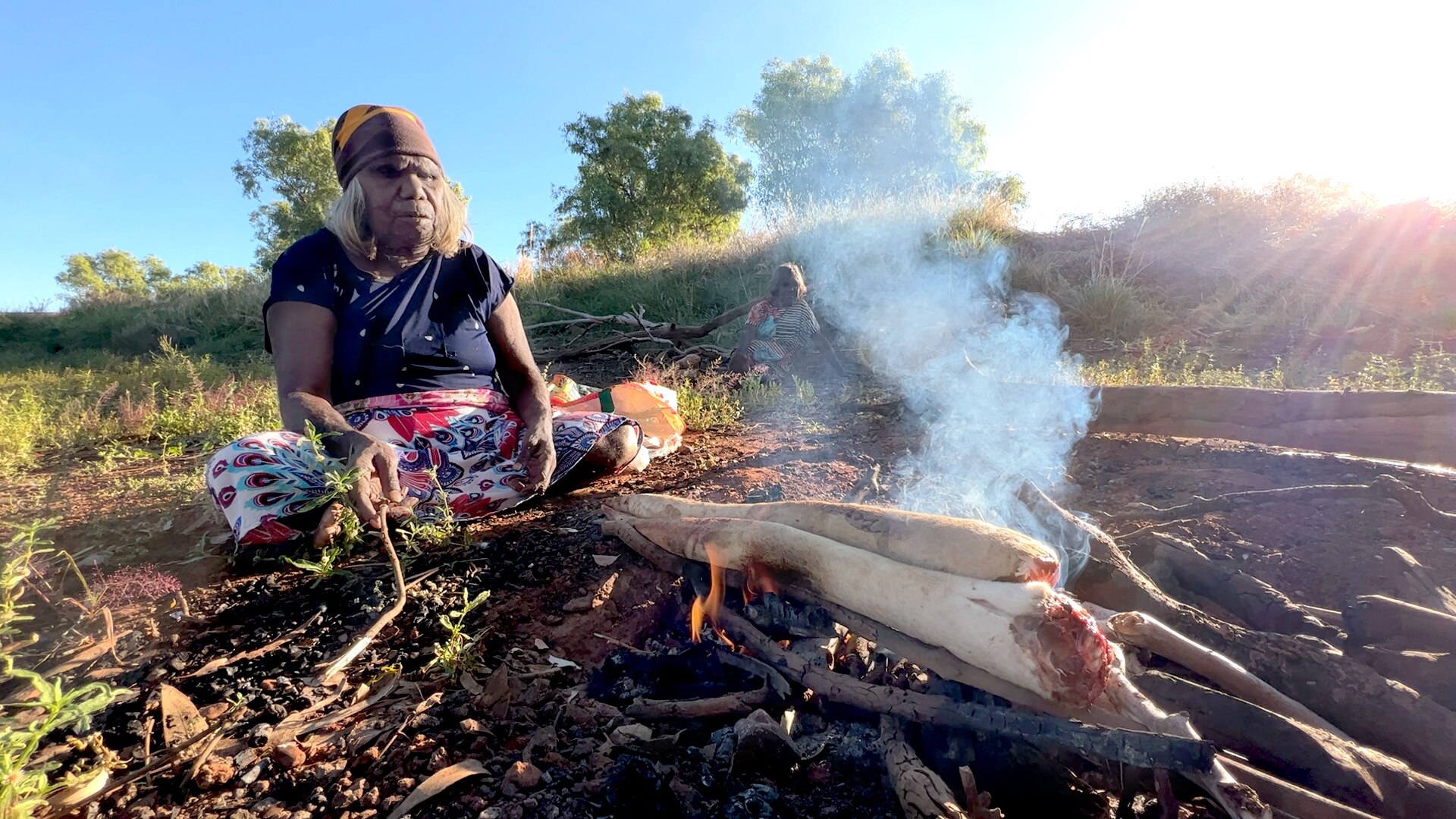 She usually cooks her supper on a campfire, in part because she likes being outside with her family gathered around the fire, speaking in her native Kukatja language.