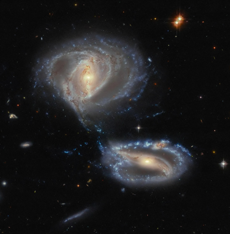 Nestled between the two galaxies — just above the upper arm of NGC 7733 — is a knot-like structure glowing with a different colour and obscured by dark dust.