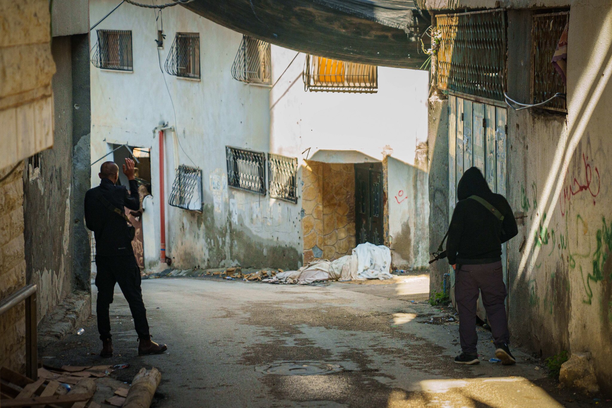 The streets of Jenin refugee camp are nearly empty, apart from two young men dressed in black jumpers, with M16 rifles slung across their chests.