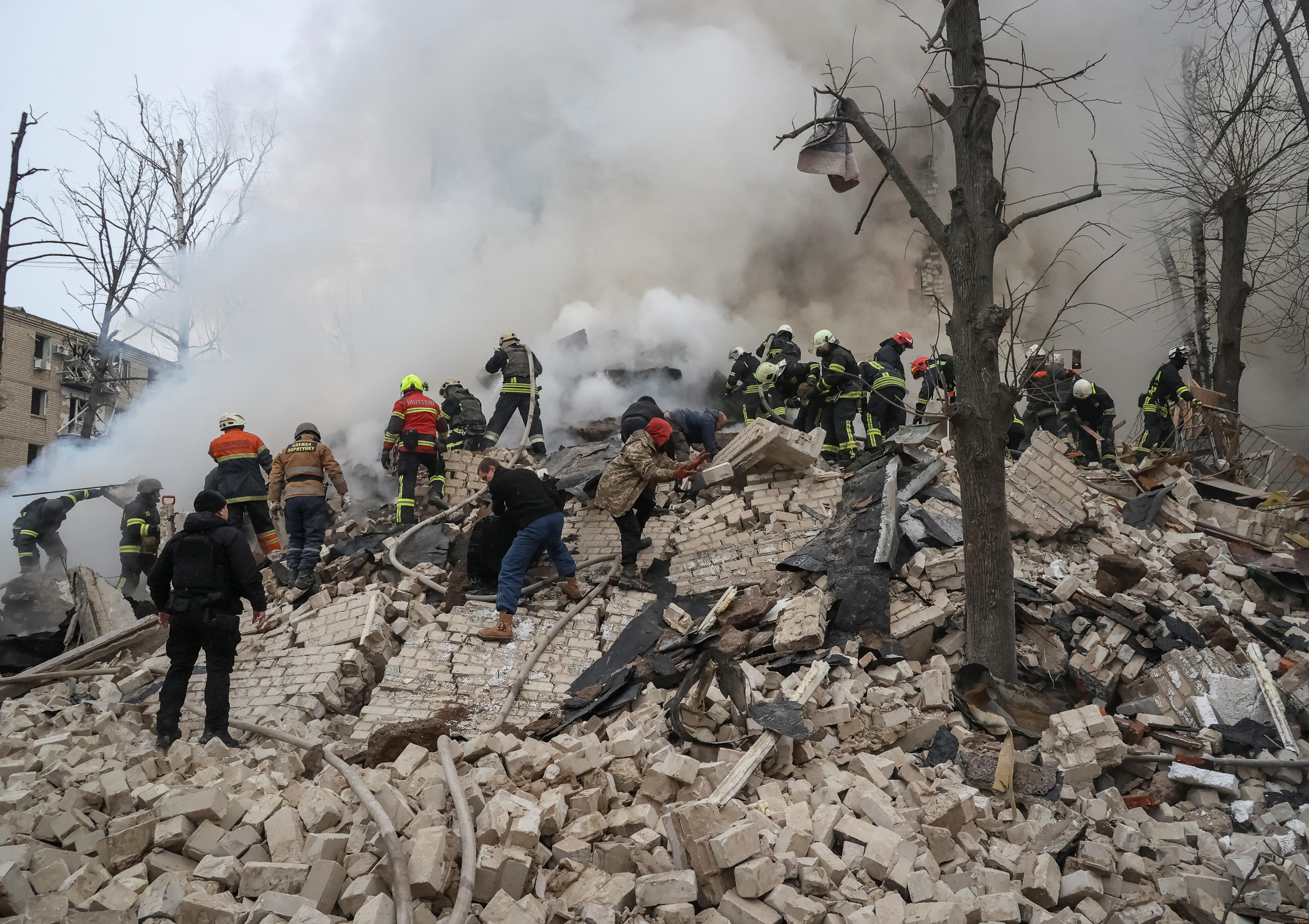 Kharkiv Mayor Ihor Terekhov said an entire section of a multi-story residential building was destroyed, trapping an unknown number of people there.