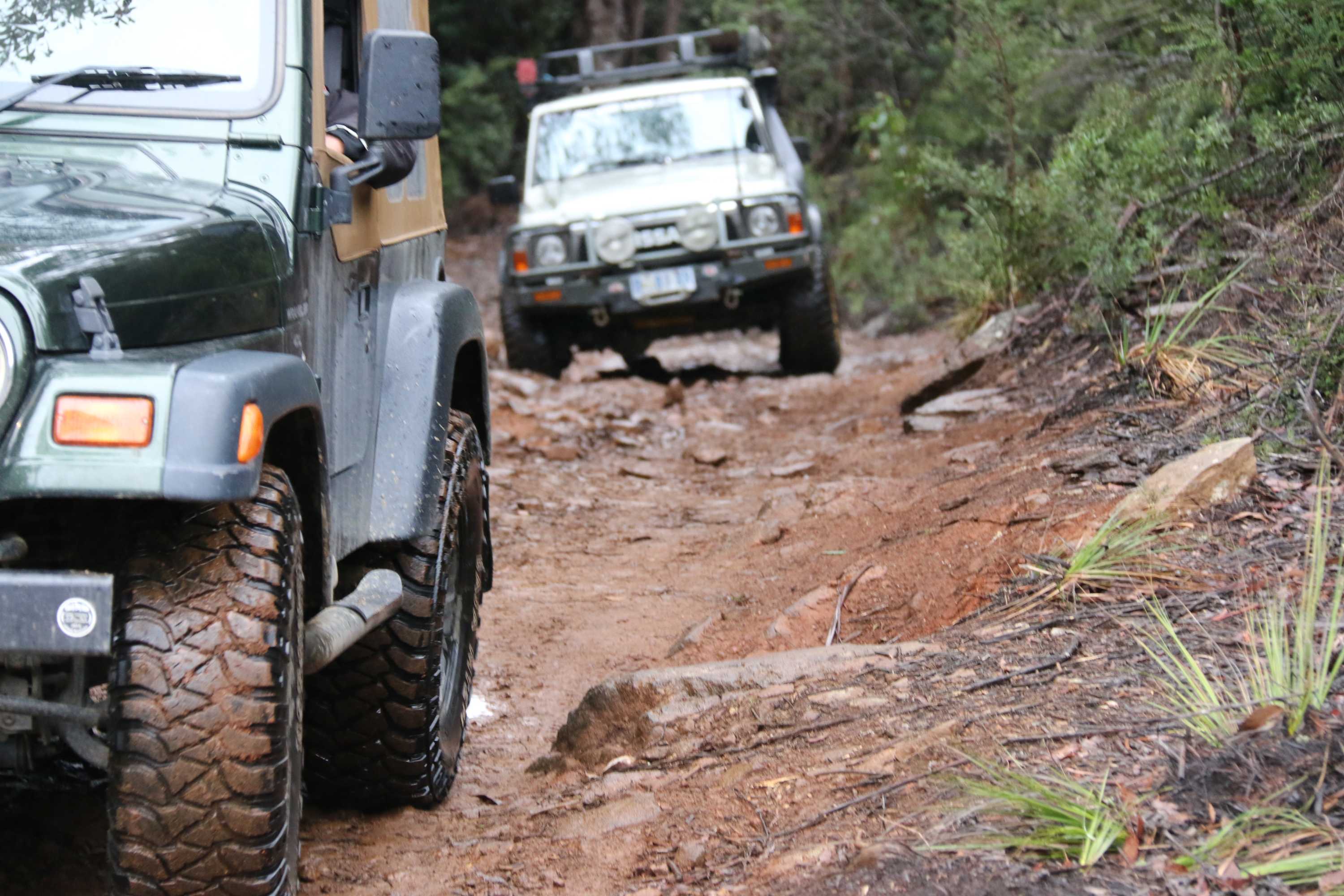 Four wheel driving enthusiasts driving down a muddy track in southern Tasmania