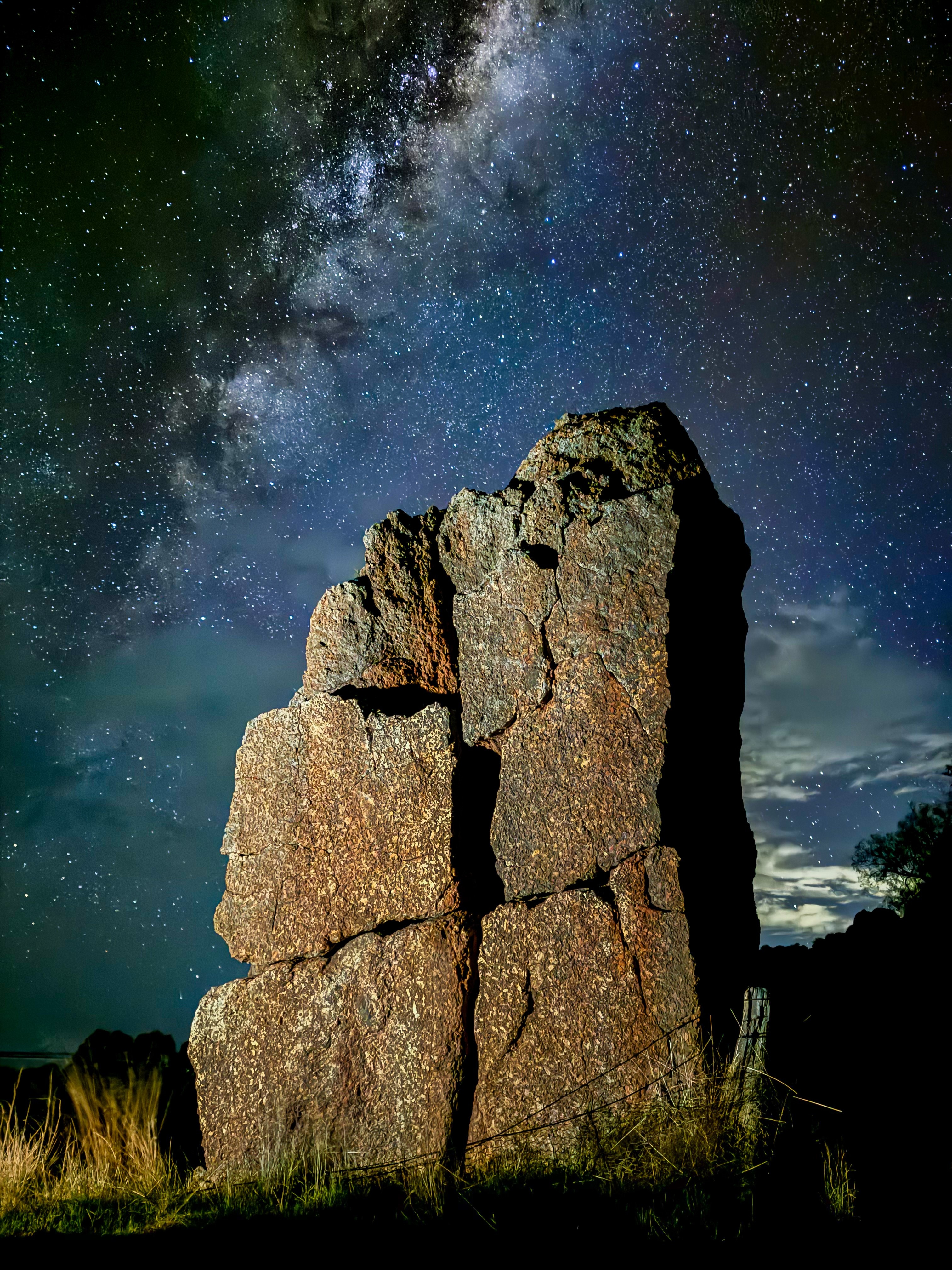 A composite image of a rock silhouetted against the Milky Way, and the same rock lit up.