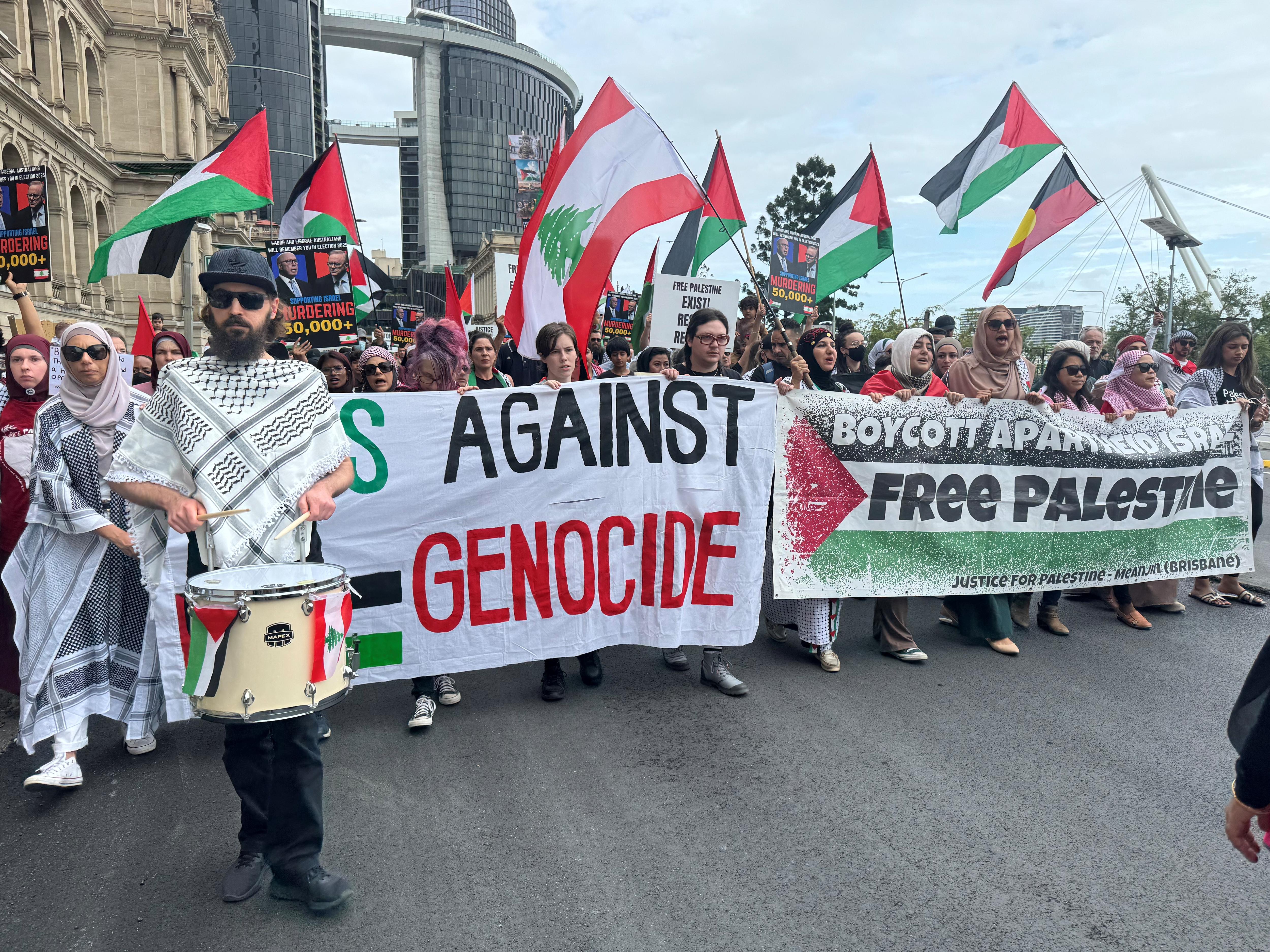 Pro-Palestinian protesters calling for the federal government to demand a permanent ceasefire in the Middle East have marched through Brisbane in one of the largest protests seen in the city since the war began a year ago.