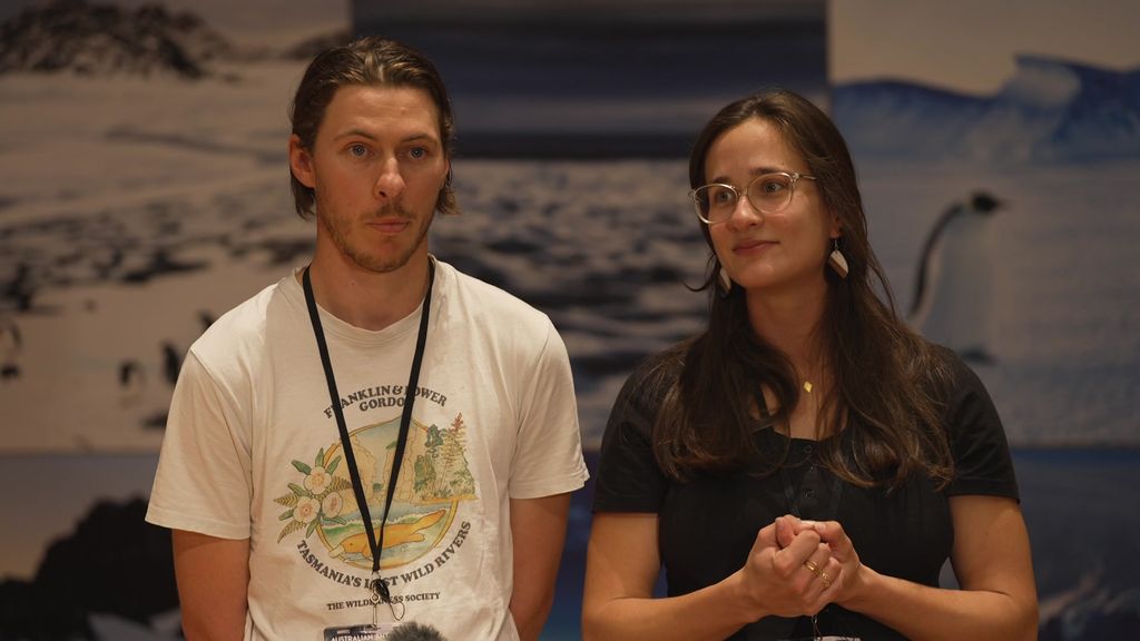 James Wyatt, pictured with Dr Natalia Riberio, says "more funding into those areas is pretty crucial to understand how it's going to affect our planet". (ABC News: Ebony ten Broeke)