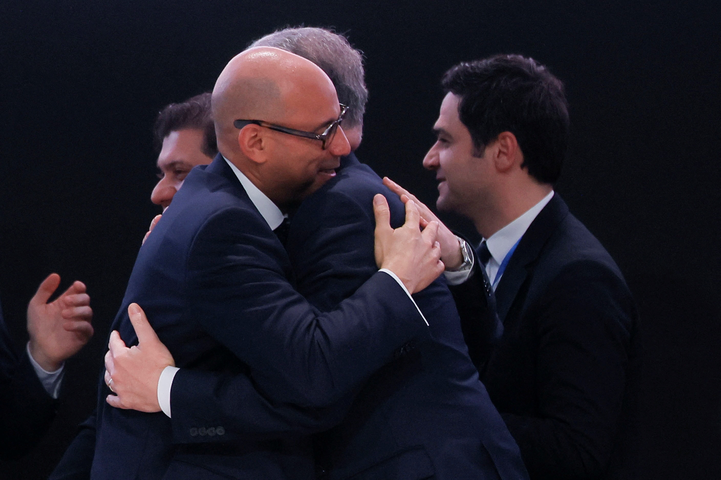 COP29 president Mukhtar Babayev embraced Simon Stiell, executive secretary of the United Nations Framework Convention on Climate Change, during the summit's final day. (Reuters: Maxim Shemetov)