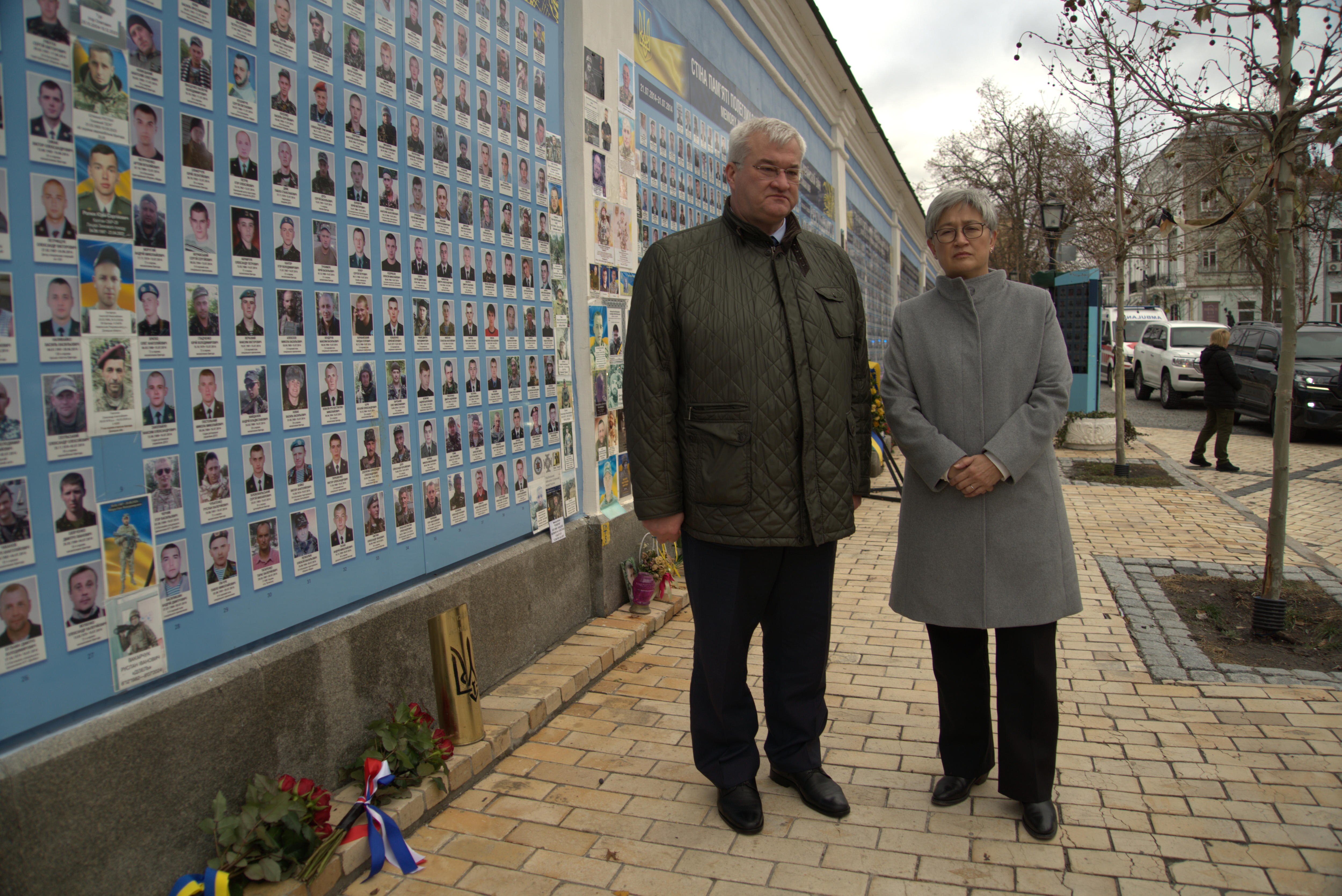 Penny Wong and Andrii Sybiha paid their respects to fallen Ukrainian soldiers at a memorial in Kyiv. (ABC News: Mazoe Ford)