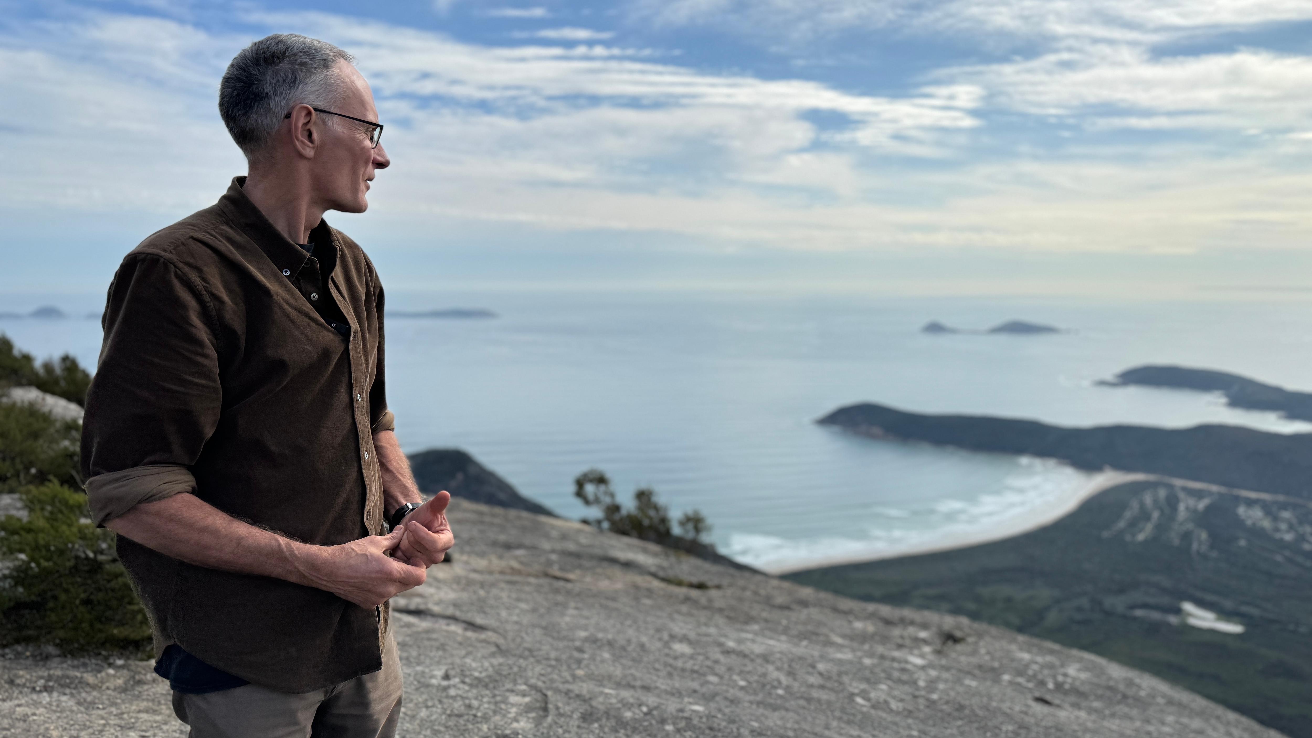 Mark Norman takes in the view from the summit of Mount Oberon. (ABC Gippsland: William Howard)