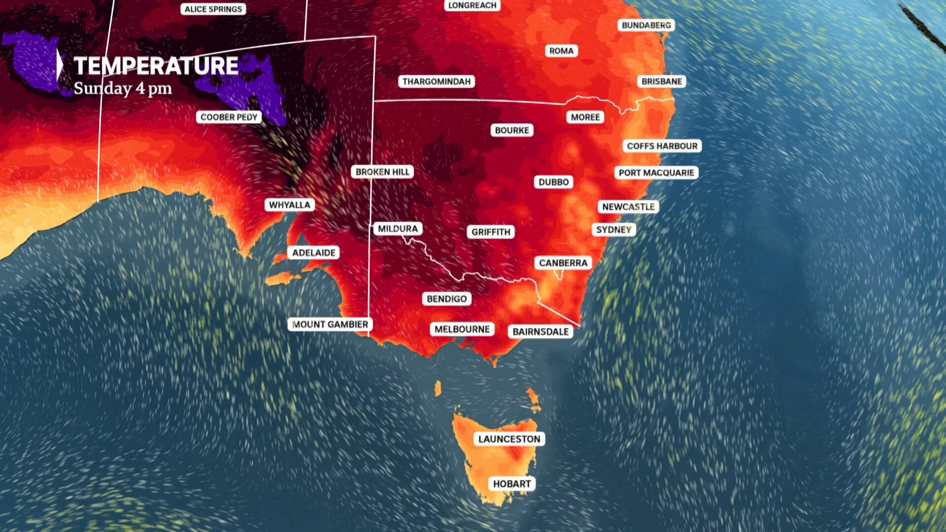 The hot north-westerly winds will continue through Sunday, leading to a second consecutive day above 40C for the south-east inland, however the heat will also reach eastern NSW, sending Western Sydney to 39C.