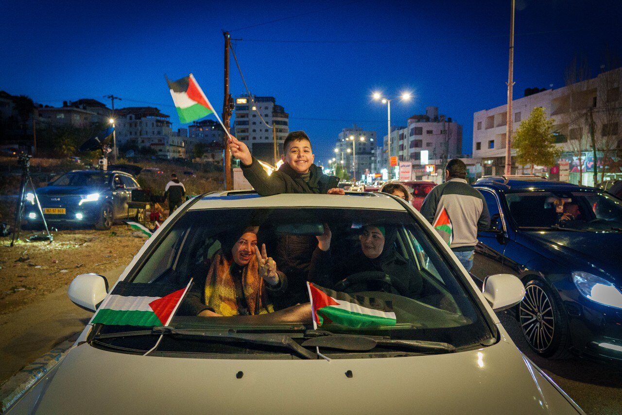 People in the West Bank celebrate the ceasefire between Israel and Hamas on Sunday night. (ABC News: Mitch Woolnough)