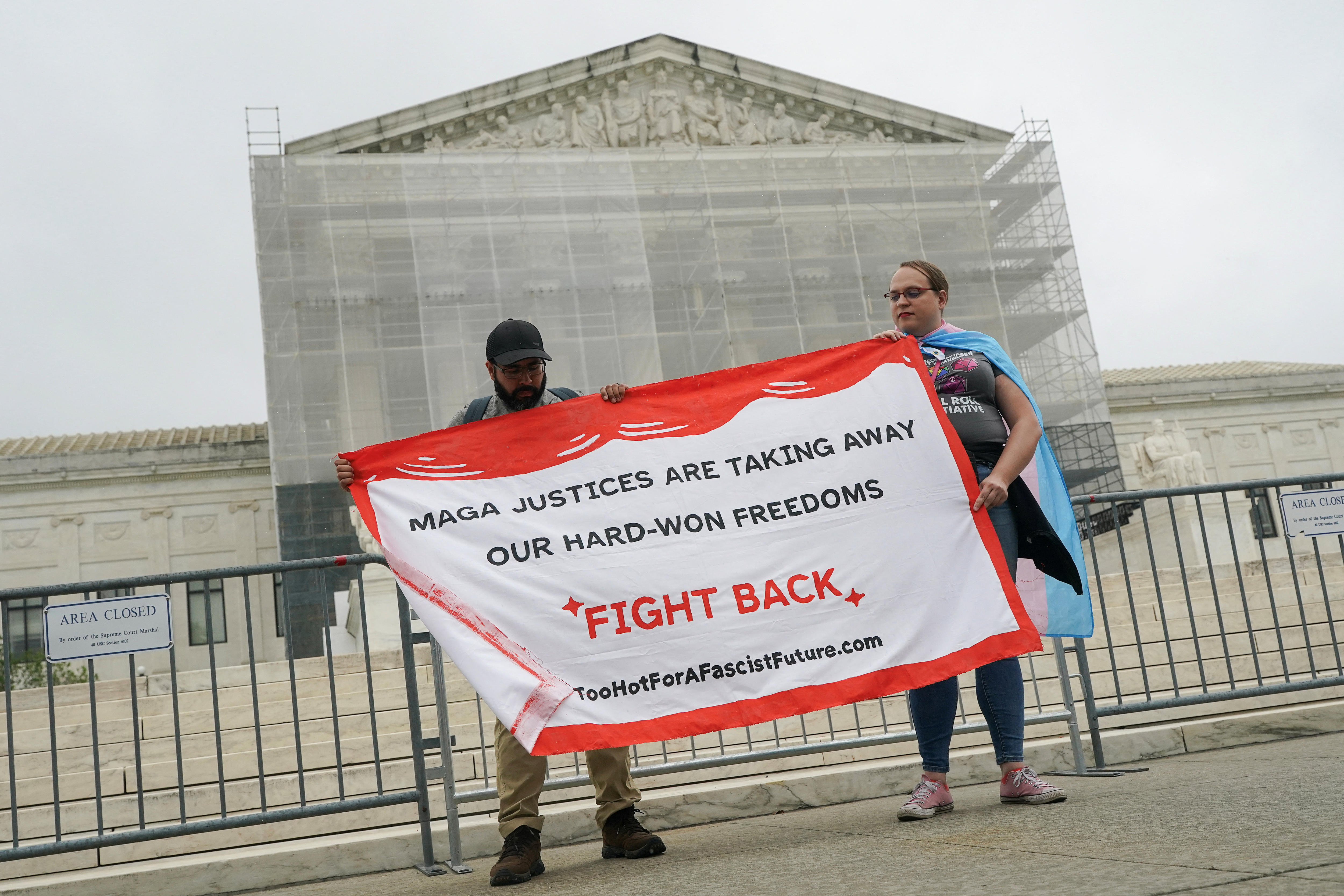 Demonstrators hold a banner reading 'MAGA justices are taking away our hard-won freedoms' outside the court in Washington DC. (Reuters: Nathan Howard)