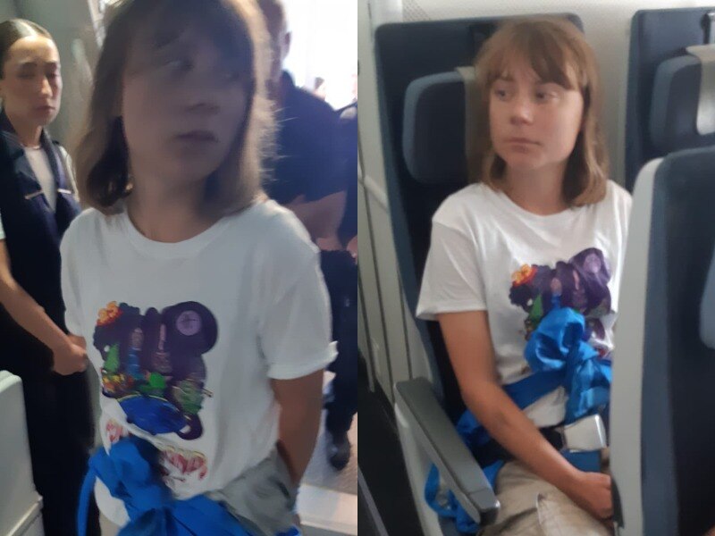 Greta Thunberg is pictured on a flight to France after being detained by the Israeli army. (Supplied: Israel Foreign Ministry/X)