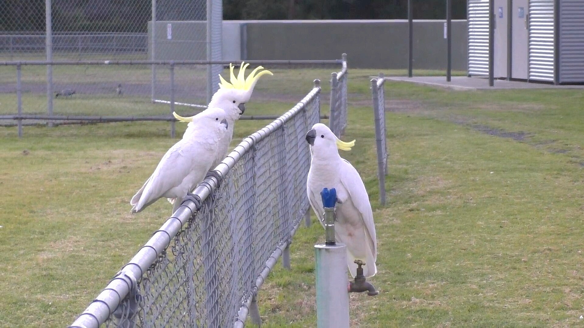 Sulphur-crested cockatoos line up to take a drink from a public bubbler at a Sydney sporting reserve. (Supplied: Royal Society Biology Letters)