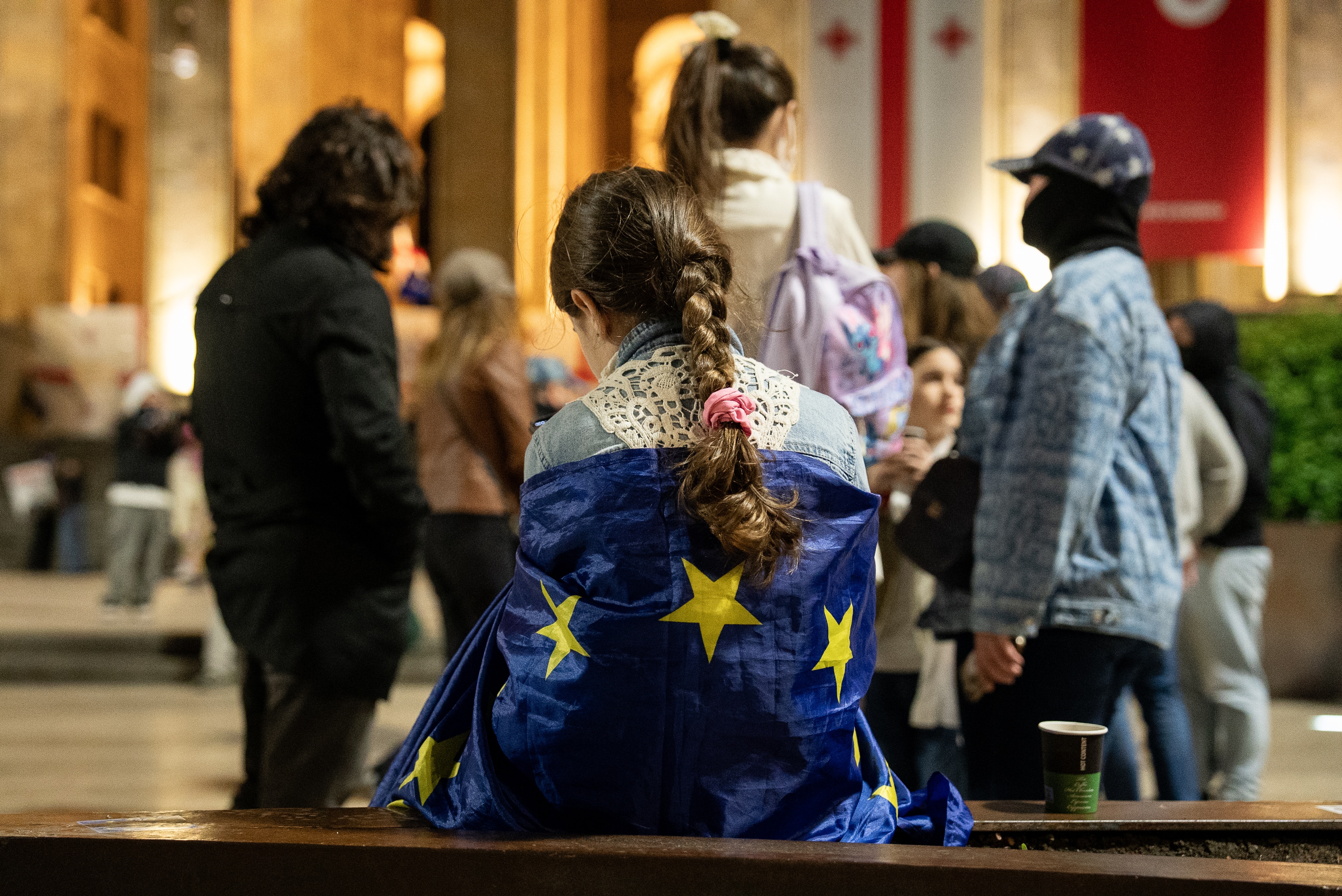 A young girl wrapped in an European Union flag amid protests outside the national parliament in Tbilisi, the capital of Georgia. (Foreign Correspondent: Stephanie March)