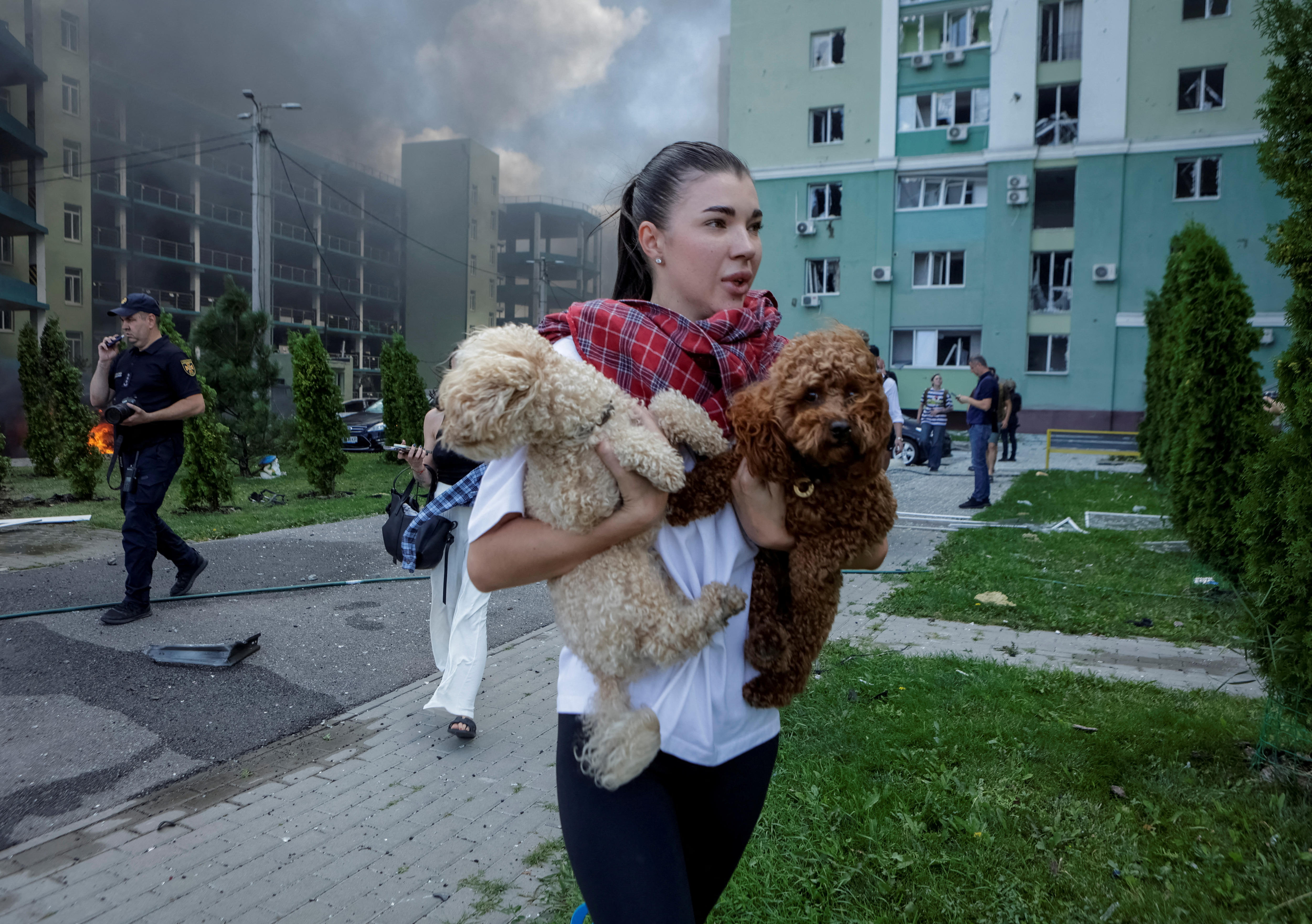 A woman flees with her dogs after a Russian air strike in Kharkiv. (Reuters: Sofiia Gatilova)