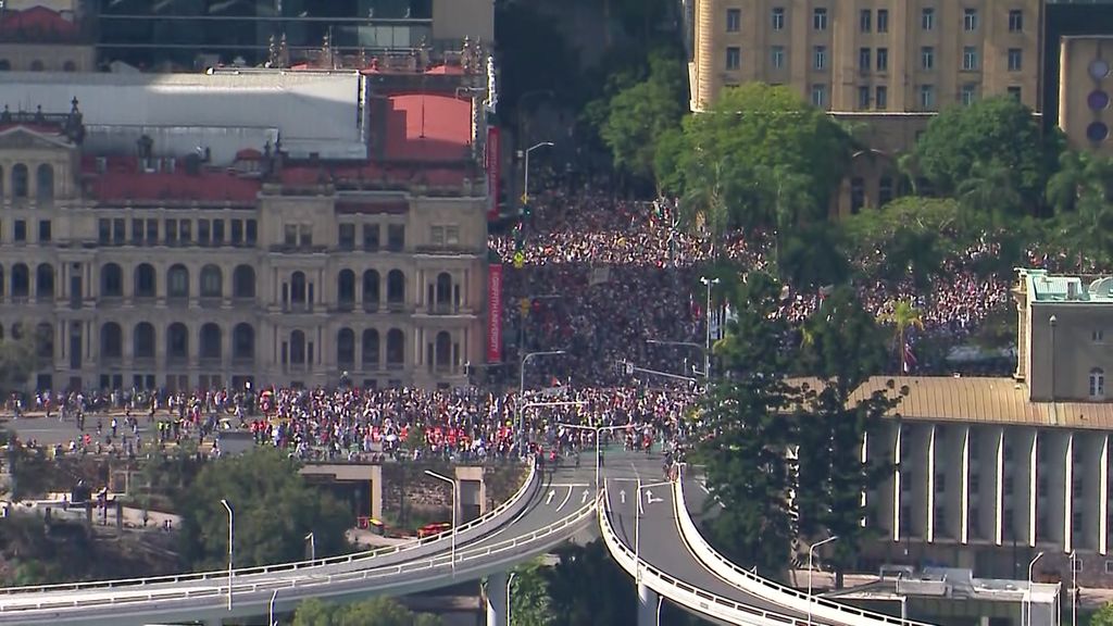 Queenslanders filled out Brisbane’s Queens Park in the CBD ahead of their march to Musgrave Park in West End. (ABC News)