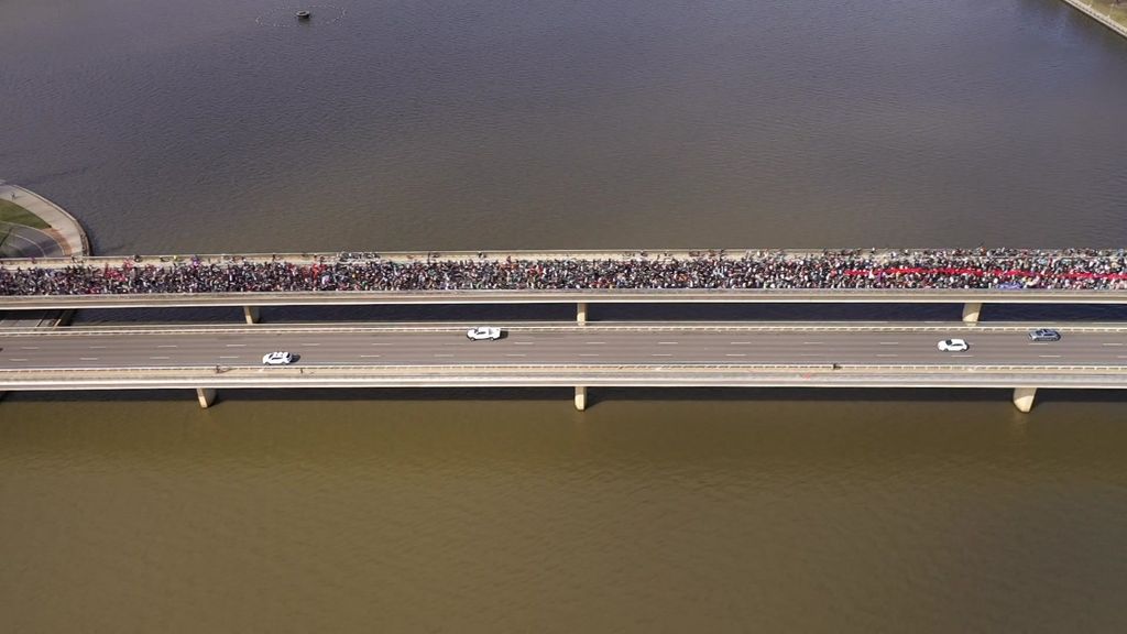 Aerial vision of the pro-Palestinian protest on Canberra's Commonwealth Bridge.
