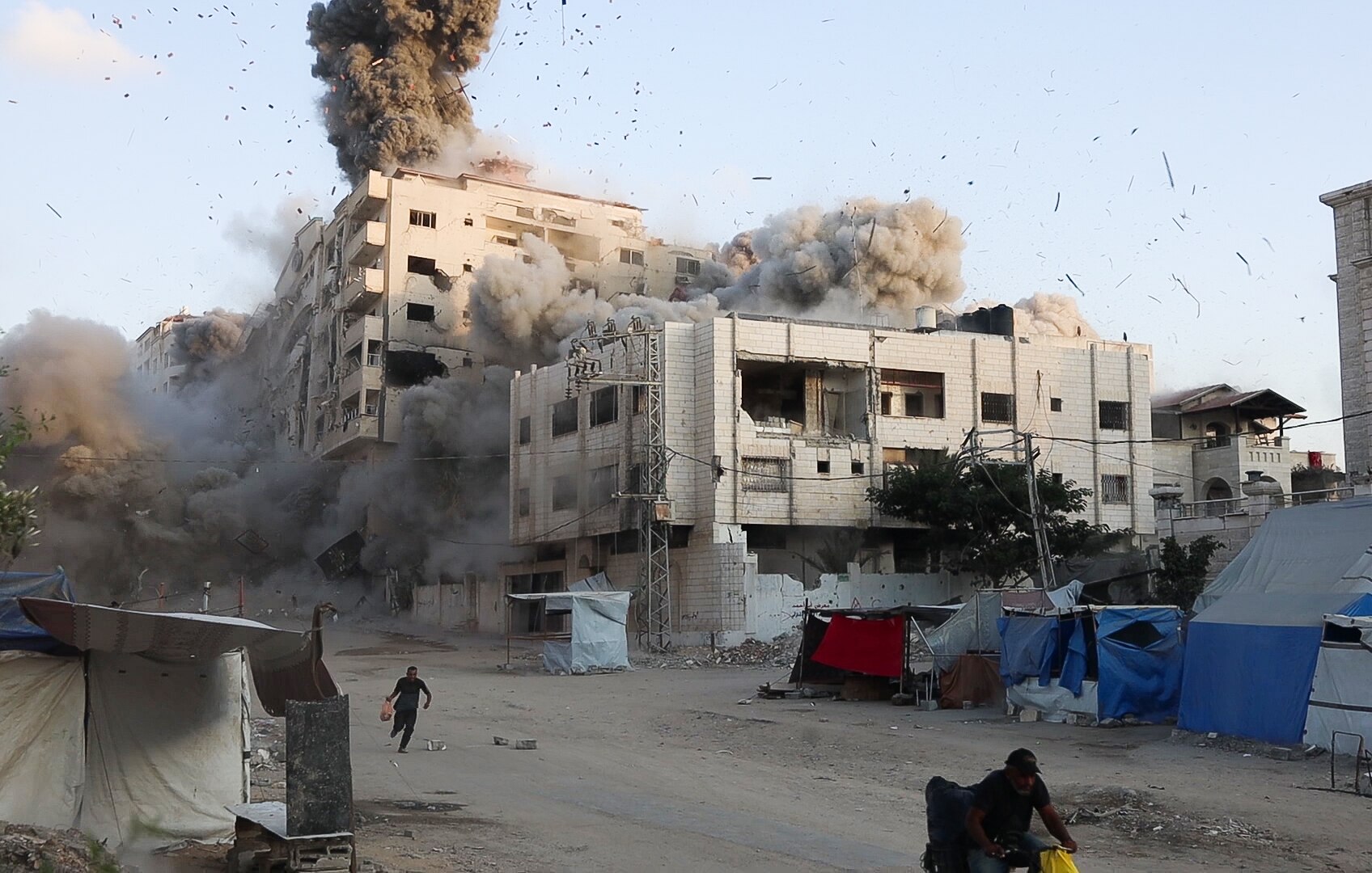 Two men are seen fleeing the moment the Israeli military hit Al-Roya tower in Gaza City on Sunday, September 7, 2025. (ABC News)