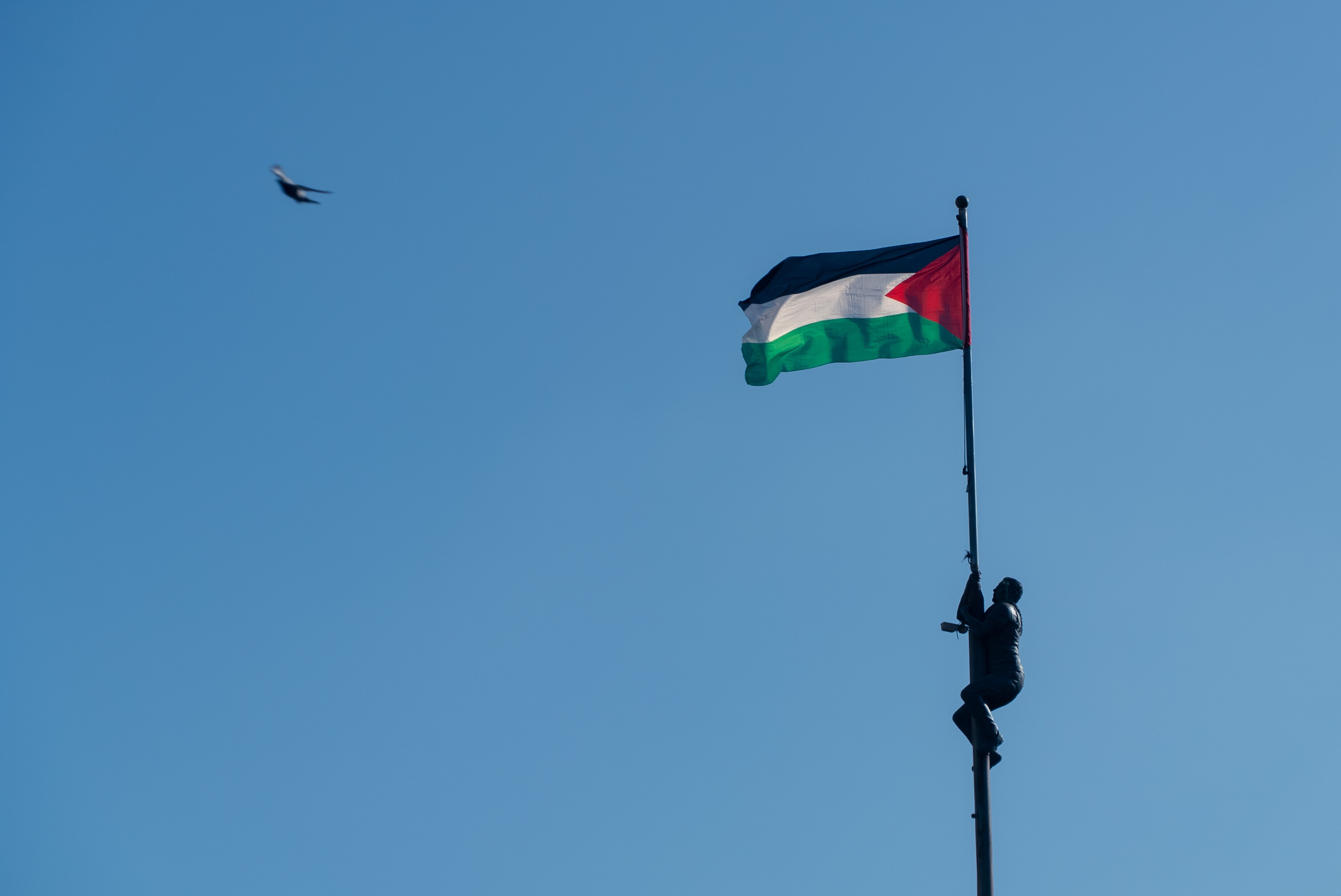 In Yasser Square, in the heart of Ramallah in the West Bank, is a statue of a young man climbing a flagpole.