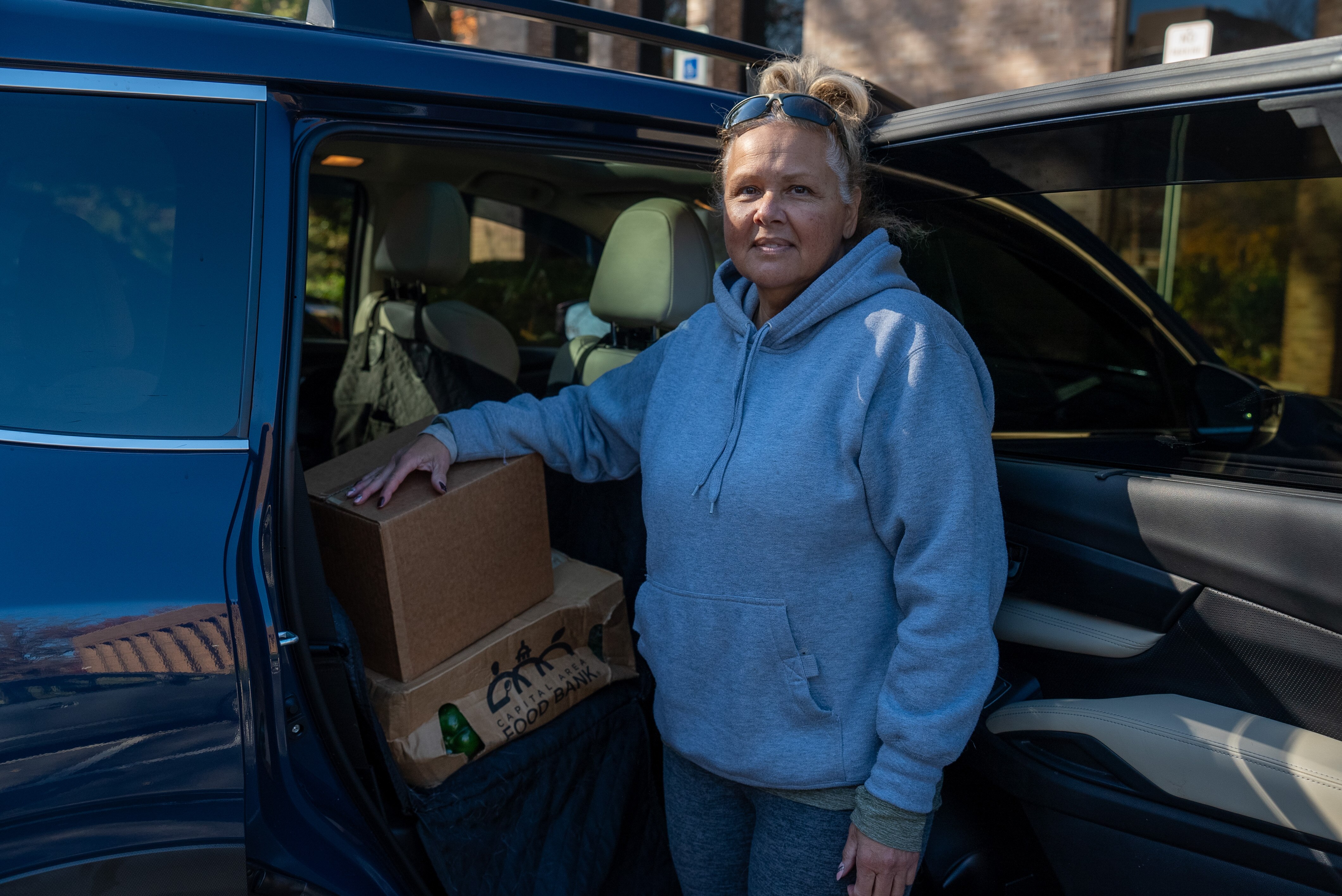 She is among dozens who have queued outside a food bank in Maryland to get supplies to survive the week. It is her second time here.