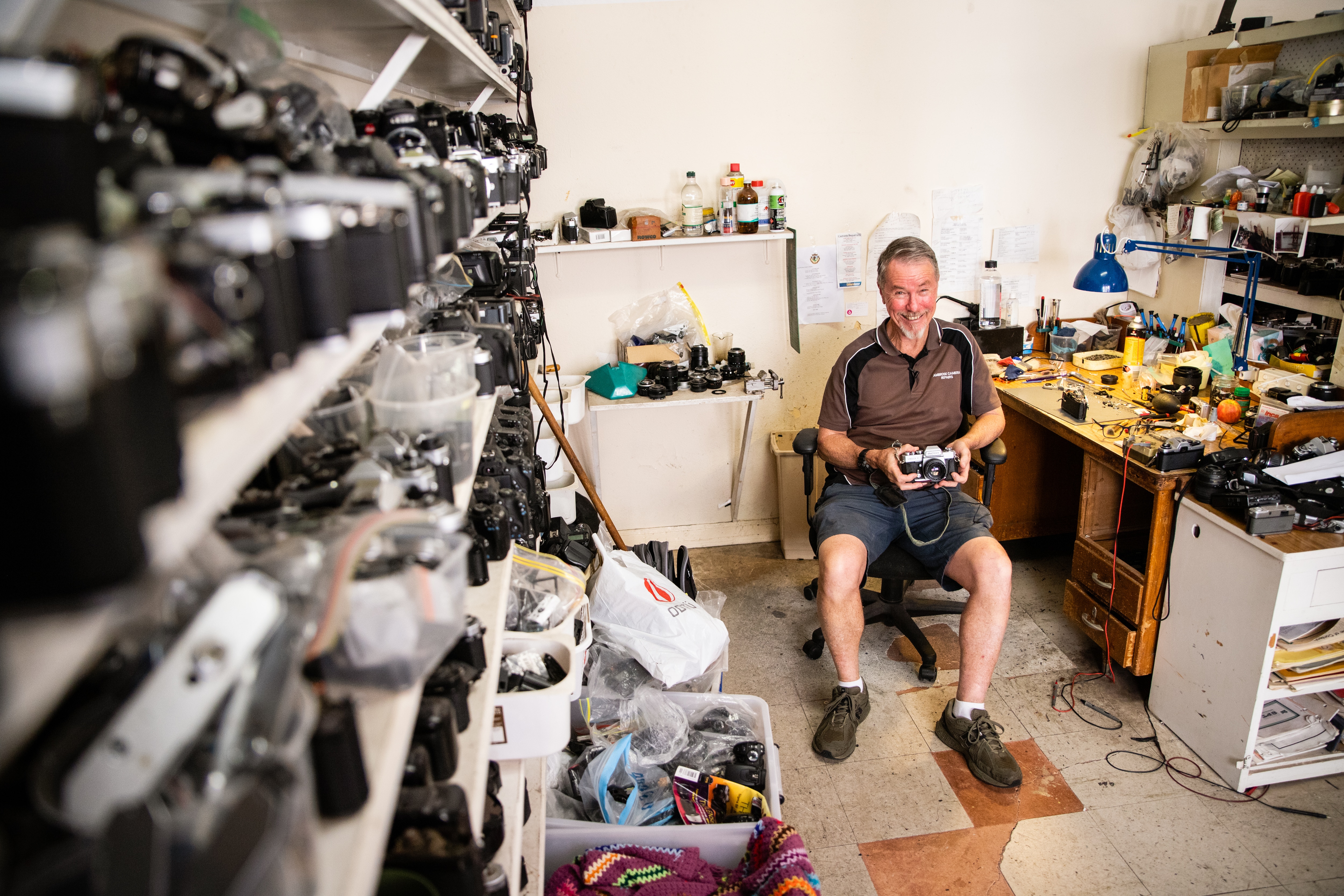 It's an environment the technician knows well — after all, he's been fixing cameras for almost half a century.